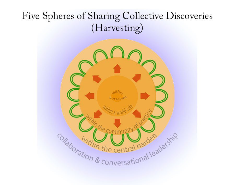 A third sphere of harvesting, or sharing collective discoveries, is something that can happen within a community of practice after hosting a World Cafe or other process. It’s an open sharing of experience – what worked, what didn’t, etc. – that is part of a larger hosting practice whereby whatever any one individual or team is learning informs the learning and understanding of the whole community.